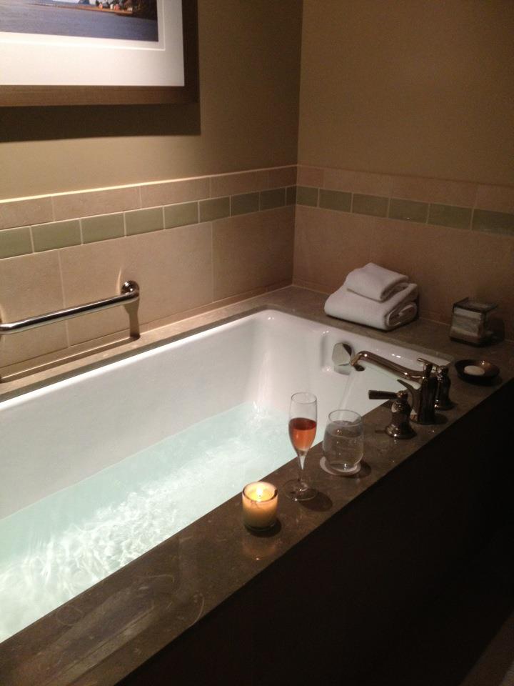 And I am here now at this beautiful seaside resort. When I arrived yesterday, the ski was brilliant blue, and I had a lovely walk down to the beach at sunset. I enjoyed a fruit and cheese plate and a long aromatherapy bath in my soaking tub (photo above), with candle and champagne.